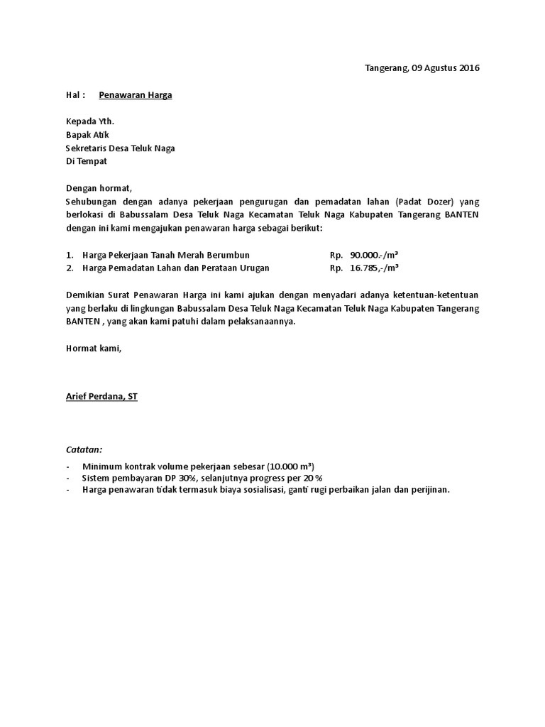 Pada saat jual beli produk, perlu ada kesepakatan soal metode pembayaran yang akan digunakan. Untuk mendapatkan respon yang baik dari calon pelanggan, maka anda harus bisa memberikan penawaran harga yang menarik. 3.790 m2 status tanah : Hal ini perlu anda sampaikan dalam surat penawaran. Contoh surat permintaan penawarandefisini dari surat permintaan penawaran yaitu merupakan salah satu jenis surat yang digunakan dalam dunia bisnis yang berisi sebuah tawaran mengenai barang maupun jasa dari produsen kepada pelaku bisnis lainnya.
